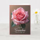 This card features a large, fully opened pink rose in close-up, its many petals curling outward like a gentle embrace that suggests affection ❤️. The color shifts from a deeper rosy center to softer blush edges, giving the flower a tender, romantic look. Soft, diffused lighting glides over the petals, creating small highlights and shadows that feel calm and intimate. Tiny water droplets cling to the outer petals, sparkling like morning dew and adding a fresh, cared-for touch 🌼. A softly blurred backdrop shows dark green leaves behind the bloom, keeping the focus on the flower while still placing it in nature. Along the lower area, white lettering reads “WITH LOVE Grandma HAPPY MOTHER’S DAY,” set neatly beneath the rose against the warm background. The scene is framed by a muted warm brown field with a slim pink border around the edges. The rose sits centered with the message aligned below it, and the pink border traces the outer edge of the design.