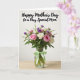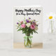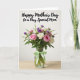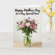 This card features a tall, vertical layout centered on a clear glass vase holding a full bouquet that feels like a gentle hug ❤️. Soft pink roses open toward each other among creamy white flowers, with the close spacing giving the arrangement a quietly romantic, caring look. Small clusters of deep purple blossoms peek through the greenery, adding contrast and a sense of lively companionship between the colors. A pale green ribbon is tied around the vase neck, its smooth loops resting neatly against the glass. The background is a light neutral tone with a faint texture, and the flowers sit on a pale wooden surface that keeps the scene calm and homey 🌼. Near the top, the message “Happy Mother’s Day to a Very Special Mom” appears in black lettering, centered above the bouquet and easy to read. Soft, even lighting highlights the fresh petals and makes them look lightly dewy. The purple florets dot the bouquet like tiny accents between the pink and white blooms, framed by lush green leaves.