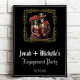 This engagement party welcome sign presents an intriguing and visually striking design, featuring a black background that serves as a dramatic canvas for the main illustration. The invitation itself is made of high-quality, textured paper with a velvety finish, adding a touch of luxury to the overall appearance.
