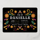 Celebrate a Day of the Dead themed birthday with these cute invitations featuring colorful flowers trimmed with gold foil, surrounding your party details in white lettering on a black background.