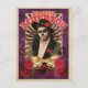 Vintage Day of the dead (Dia los de Muertos) Mexican travel poster from Oaxaca Mexico featuring a handsome face painted sugar Skull man surrounded by gold guns, red and black roses on a purple and pink background.