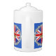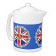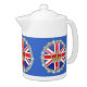 A Teapot with a round design of a Crown with diamonds and sparkle effect and text to personalise with your monogram ,framed with an image of a ring of Diamonds and sparkle effect around it ..on a background of a Union Jack and deep royal blue.