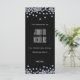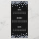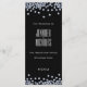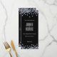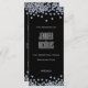 A simple yet beautiful modern wedding reception menu in black and white with blue accents. To the top and bottom edges of the card are faux diamond effect glitter sparkles.