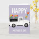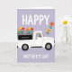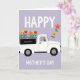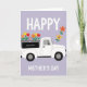 Designed with a cheerful spring scene, this card shows a white utility vehicle with rounded lines centered on a light lavender background patterned with a faint diamond grid. The open bed is piled high with tulip-like red and yellow blooms mixed with orange and purple daisy-like flowers, like a bright bouquet headed to someone special ❤️. Above the vehicle, the word “HAPPY” sits in large white sans-serif letters, spaced to feel airy against the pastel backdrop. Below the wheels, “MOTHER’S DAY” appears in matching white letters, balanced and easy to read. A small dark rectangular panel on the vehicle’s side includes tiny generic gift-related wording, adding a thoughtful, caring touch without drawing focus. Off to the right, a diagonal trail of loose flowers drifts upward as if carried by a light breeze, giving the scene a gentle, affectionate motion 🌼. The overall look stays flat and graphic with crisp outlines and a soft pastel setting that makes the flower colors stand out. Several individual blossoms float near the upper right corner, echoing the colors from the truck bed.