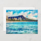 Waikiki beach in Honolulu, Hawaii is known for its beautiful white sand, clear blue waters, and stunning views of Diamond Head. This Hawaii art postcard is part of a series of postcards created in a post-impressionism art style and is inspired by different locations around the world.