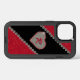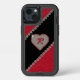 Ornate metallic look Otterbox brand iPhone case done in black, with graphics of red glitter and faux diamonds, in the top left and bottom right corners. Graphics of diamond mosaic style heart, in the middle, has a red one letter monogram ready to personalize.