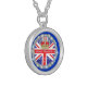 A Pendant necklace with a round design of a Crown with diamonds and sparkle effect and text " Elizabeth II Diamond Jubilee 1952-2012 framed with an image of a ring of Diamonds and sparkle effect around it ..on a background of a Union Jack and deep royal blue .