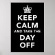A poster parody of the 1939 government public information poster bearing the words 'Keep Calm And Take The Day Off' in white text.