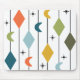 This mouse pad has a mid-century modern design of vertical lines with diamonds and boomerangs, with starbursts scattered in the background.
