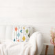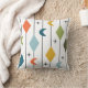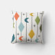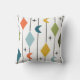 This throw pillow has a mid-century modern design of vertical lines with diamonds and boomerangs, with starbursts scattered in the background.