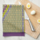 This kitchen towel has a mosaic tiles / beads pattern with a diamond motif centered, in cool colors of purple, violet, sage green, chartreuse, and soft muted periwinkle blue, with creamy tan "grout", side borders in purple and violet. Can be visualized as mosaic tiles, or beading. Art by Kristie Hubler. For Spring Season 2015 fashion trend colors.