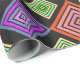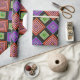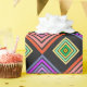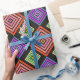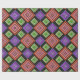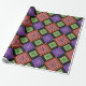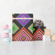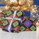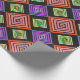 This wrapping paper has a geometric design of concentric diamonds in orange and pink, blue and purple, and yellow and green, on a black background.