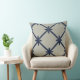 This simplistic design features a repeating pattern of dark blue diagonal bands and shapes on a taupe background, evoking a sense of symmetry and order.
