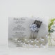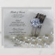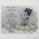 Customize the pretty Diamond Rings and Pearls Wedding Menu with the details of the meal that you will serve at your wedding dinner or luncheon by adding the salad or first course, entree or second course and dessert or third course. Personalize it with the names of the bride and groom, reception location and marriage ceremony date. This elegant custom wedding menu features a close up photograph of a diamond engagement ring and wedding band set with a white pearl necklace.