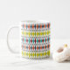 This mug has a mid-century modern design of stretched diamonds and starbursts on a field of white.