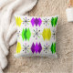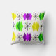 This throw pillow has a mid-century modern design of diamonds and starbursts in Mardi Gras colors of shades of purple, green, and yellow