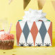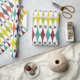 This wrapping paper has a mid-century modern design of stretched diamonds and starbursts on a field of white.
