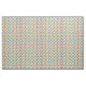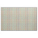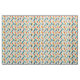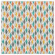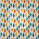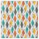 This fabric has a mid-century modern design of diamonds in orange, yellow, turquoise, gray, and outlined scattered throughout on a field of white.