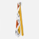 This necktie has a mid-century modern design of diamonds scattered about in orange, gold, turquoise, gray, and outlines on a field of white