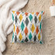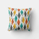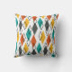 This throw pillow has a mid-century modern design of diamonds in orange, yellow, turquoise, gray, and outlined scattered throughout on a field of white.