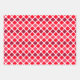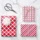 This trio of wrapping paper sheets is perfect for Valentines Day, but works well for other occasions too. Sheet one is in shades of red and pink these diamond shapes are on a white background. The second sheet is red and pink circles with white hearts, and the third sheet is red and white stripes on an angle.