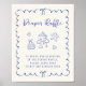Cute light cream diaper raffle drop off sign for your baby boy shower featuring a french blue wavy frame adorned with bows, whimsical blue hand drawn illustrations of hearts, stars, cake and nursery decor, and "Diaper Raffle" showcased in a fun, playful blue script.