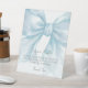 This charming tabletop sign features a large, elegant watercolor bow in soft baby blue that spans the entire design, creating a bold and versatile statement. At the bottom, a subtle white ombre gradient fades over the bow, ensuring the text is easy to read while preserving the stylish look. The sign invites guests to drop off their pack of diapers for the mom-to-be and enter the raffle by submitting their tickets from the invitation mailing.