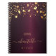 A dark burgundy faux metallic looking background, decorated with faux gold dripping stars. Template for a year. Personalize and add a name and a title. The name is written with a golden modern hand lettered style script with swashes. Can be used as a diary, for journaling, taking notes, to-do lists.