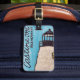 The Dice Head Light luggage tag is vibrant and fun. It features a image of a hand-painted lighthouse against a vivid sky, crafted from durable lucite. The tag is thick, hefty and strong. A sturdy buckle strap, in a coordinating color, ensures it attaches securely to any luggage handle. The overall aesthetic is playful yet chic, and makes your bag noticeable at baggage claim.