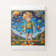 A young child standing on a yellow brick road, surrounded by a whimsical landscape. Hot air balloons, airplanes, and spaceships soar in the starry sky above rolling green hills. Asian pagodas frame the scene. The vibrant colors evoke a sense of adventure and wonder.