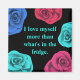 A square fridge magnet in black with color pop roses on it in blues and pinks. The writing says "I love myself more than what's in the fridge". You can change the background and text color if desired and even the wording by clicking the "customize" button.