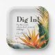 Introducing the Birds of Paradise Bliss Round Paper Plate, featuring a captivating dark green backdrop adorned with a delightful frame showcasing the exotic beauty of birds of paradise from the Birds of Paradise Bliss collection. This particular plate carries a touch of humor with the caption: "Dig in! For the record, calories don't count at weddings!" Below the caption, couples' names are playfully presented, accompanied by the date of the ceremony. This lighthearted and visually stunning design adds a unique and entertaining touch to the paper plate, making it not only a functional element but also a charming and amusing accessory that brings joy to the Birds of Paradise Bliss collection.