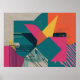 This artwork fuses a nostalgic digital aesthetic with crisp modern minimalism. Hot pinks, deep teals, mustard yellow, and punchy oranges form intersecting planes over textured gray surfaces, simulating wood grain or analog scan lines. Grids, stripes, and partial halftone patterns contribute to a sense of retro-tech disruption—as if this were a signal glitch turned into visual poetry.