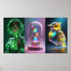 A trio of vibrant, digital renders depicts futuristic concepts with glowing elements. On the left, a female cyborg with luminous green circuit patterns looks forward, in the center, a detailed machine with spheres is encased in a glass dome, and on the right, a metallic bird with colorful highlights stands poised.