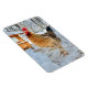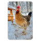 This magnet features a beautiful brown leghorn chicken posing in front of her home after a snowstorm.