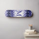 Reminiscent, of a Moroccan-style carpet, this abstract, monogram design, is displayed in-glowing colors, of navy-blue, lavender, black, and white.