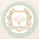 Impress your guests with these beautiful custom pickleball party drink coasters. These coasters have a watercolor image of a crest surrounded by floral branches with green and pink gingham pickleball paddles in the center. There is a green gingham border around the edge with a coordinating pattern on the back. Text says "Dinks and Drinks." Colors used include moss green, blush pink and and tan.