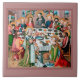 Painted in 1503 by an anonymous Middle Rhenish artist, this panel depicts the dinner mentioned in John 12:1-3 that took place in Bethany after the raising of Lazarus and just before Jesus arrived in Jerusalem on Palm Sunday. As such, the mood is celebratory--merrier and less somber than that of the Last Supper that took place the following Thursday (Maundy Thursday). It is the central panel of the triptych altarpiece that graces the Martha altar of the southern choir of the Church of Our Lady (Liebfrauenkirche) at Oberwesel, Rhineland-Palatinate, Germany. + Here, Jesus and His Twelve Apostles are seated at a round table, presumably one of several in the room since the Gospel alludes to the presence of more attendees including Lazarus. The table is viewed atilt, the better to see the tableware and foodstuffs. The Apostles converse among themselves. One (St. Bartholomew?) slices bread. In the center foreground, St. Martha, wearing an apron and carrying a platter of fish, serves (as St. John so succinctly puts it). Meanwhile, St. Mary, erroneously identified at the time the altarpiece was painted with the penitent Magdalene and a nameless sinful woman, kneels opposite. Both women wear gowns of sumptuous materials. Between them kneels the donor, Canon Peter Luteran, who is represented on a greatly reduced scale. The crowded scene brims with energy and the implied noise of animated conversations and rattling crockery. + See also the St. Martha items—aprons, oven mitts, potholders, and serving trays--from our Apron Saints series (q.v.) to mix and match! + Image Credit (M 055): Photo by Rolf Kranz of a public domain painting that is well over 100 years old from WikiMedia Commons (By Rolf Kranz - Own work, CC BY-SA 4.0, https://commons.wikimedia.org/w/index.php?curid=106002864). The photo has been tightly cropped to a borderless rectangle.
