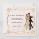 Gorgeous unique dinner and dance party invitation. Romantic image of a couple dancing. The gentleman is dressed in a black suit with tails and the lady is dressed in a cream colored dress. This invitation is highlighted with gold effect borders with flowers in each corner. Easily customizable for you to add your own party details. Each dinner and dance party invite comes complete with a white envelope.