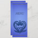dinner menu card, with dinner menu desserts, meal names. for weddings and all other meetings, ceremonies. designed with blue swirl floral pattern.