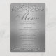 This modern and sophisticated elegant silver shimmer ornamental dinner menu can be customized. You can change the font and colors of most of the text and change the background color to different shades of shimmer. Designed by Amelia Carrie and sold exclusively through GlitterInvitations.com Note: This is a graphic print reproduction or artwork and contains no messy glitter. #silvermenu #elegantmenu #weddingmenu