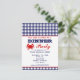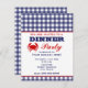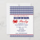 A dinner party invitation featuring a blue gingham background on front and back. Front features illustration of a crab. Pesronalize the text with details of your occasion.
