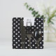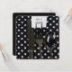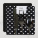 Party invite with black silverware on black with white polka dot napkin.