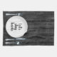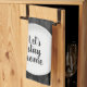 White dinner plate with silverware on rustic black wood background and "let's stay home" text.