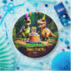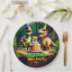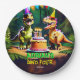 Dino four colorful dinosaur birthday party tableware personalized template party plates, dinosaurs wearing party hats with a birthday cake dinosaur birthday plates