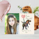 "Dino-mite" valentine theme featuring illustration of a t rex dinosaur with pink heart shaped balloon. Personalize the text and photo.