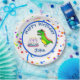 Fun dinosaur themed birthday party design features a background of confetti a various colors such as red, blue, orange, and green. There is a solid white circle with blue trim in the center. Inside the circle is a hand drawn graphic of a green tyrannosaurus rex standing next to a birthday cake. Above the t-rex and birthday cake is text in blue font that says Happy Birthday. Below the cake and dinosaur is customizable text in same blue font where you can customize with the birthday boy or girl's name. Matching Dino-Mite Time Dinosaur and Cake Birthday Party Invitations also available!
