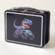 The young dinosaur exudes joy and adventure as it confidently rides the monster truck, ready to conquer any challenges that come its way. The vibrant colors and dynamic composition make this design eye-catching and captivating, ensuring it will be the envy of every lunchtime gathering.