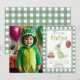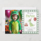 Watercolor kids birthday party. Watercolor Dino in birthday hat, cake with candles, red balloon. Green cage background.