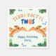 Celebrate your kid's second year of life with this cool pterodactyl birthday party napkins. These funny dinosaur napkins have green blue and orange color scheme and safari theme. Perfect for your little one's wild ride through the terrible twos. Personalize it with your event details. Unisex design for a boy or girl.